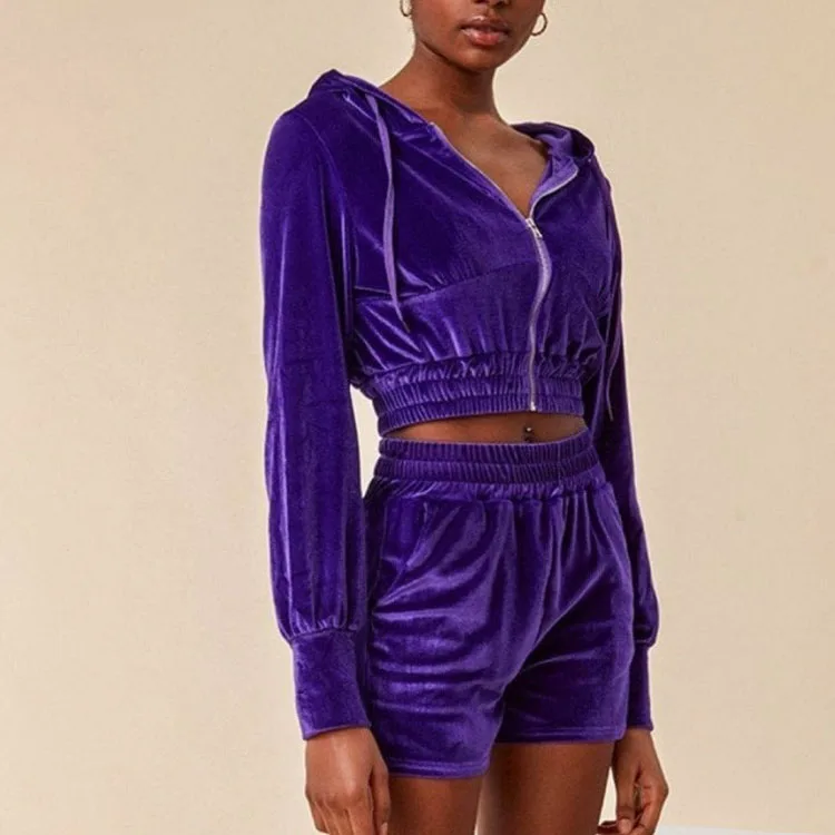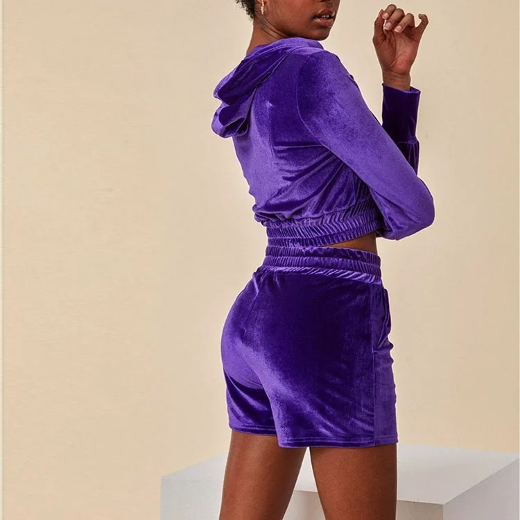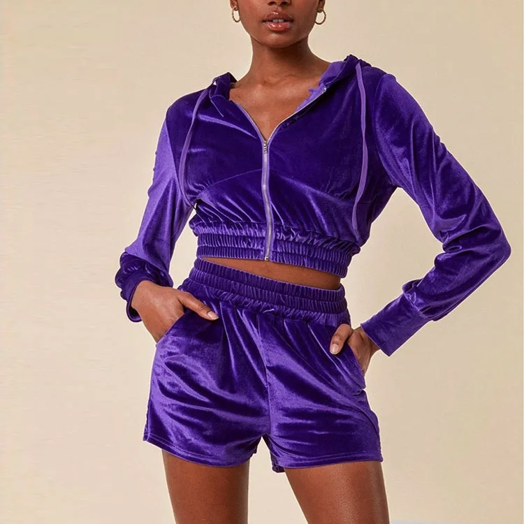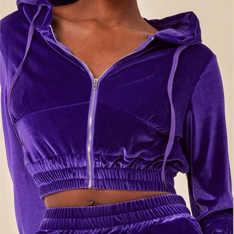 Huili OEM Factory High Quality Fitness Sportswear Y2K Zip up Hoodie Women Custom logo Printed Purple Crop Velvet Velour Hoodie